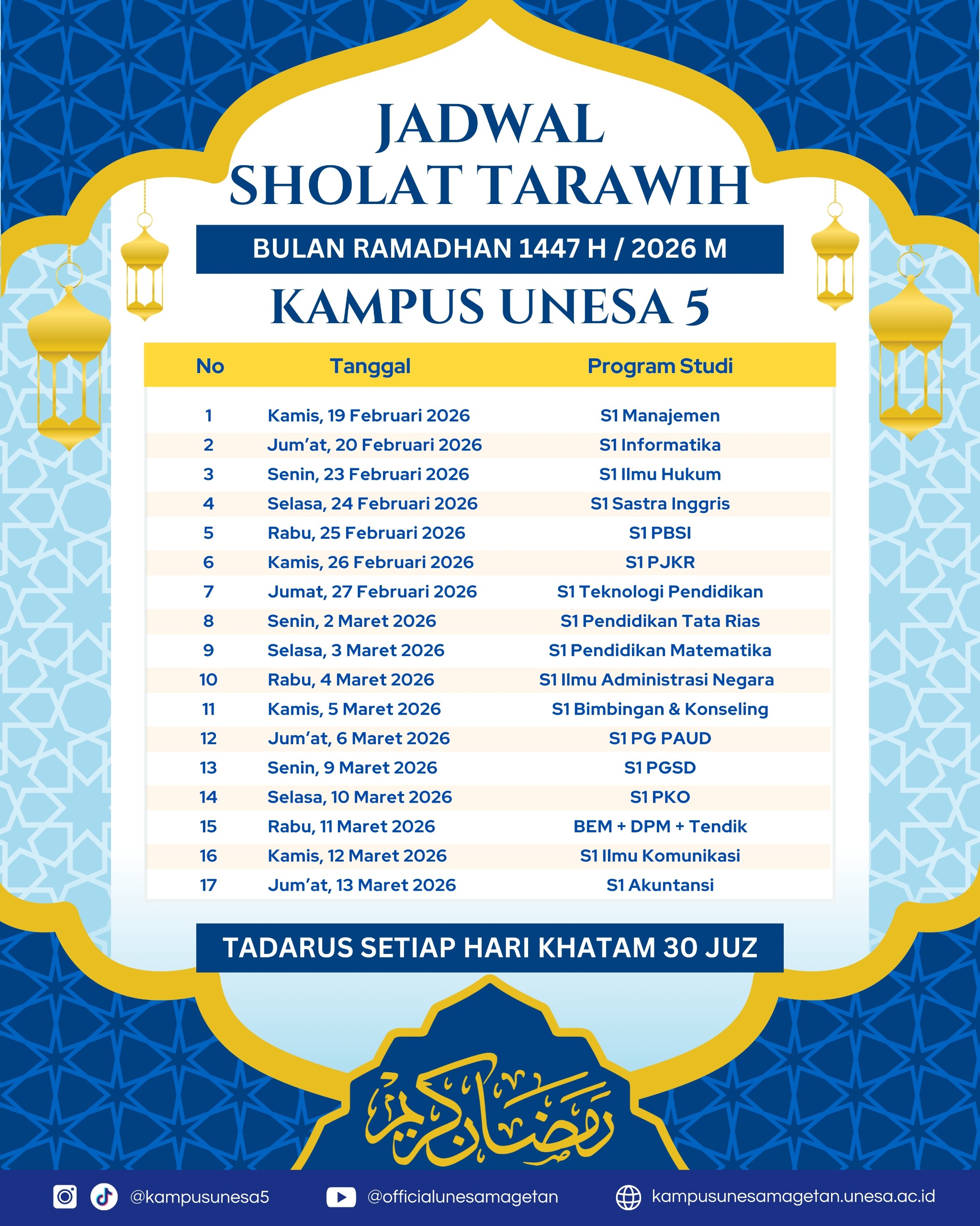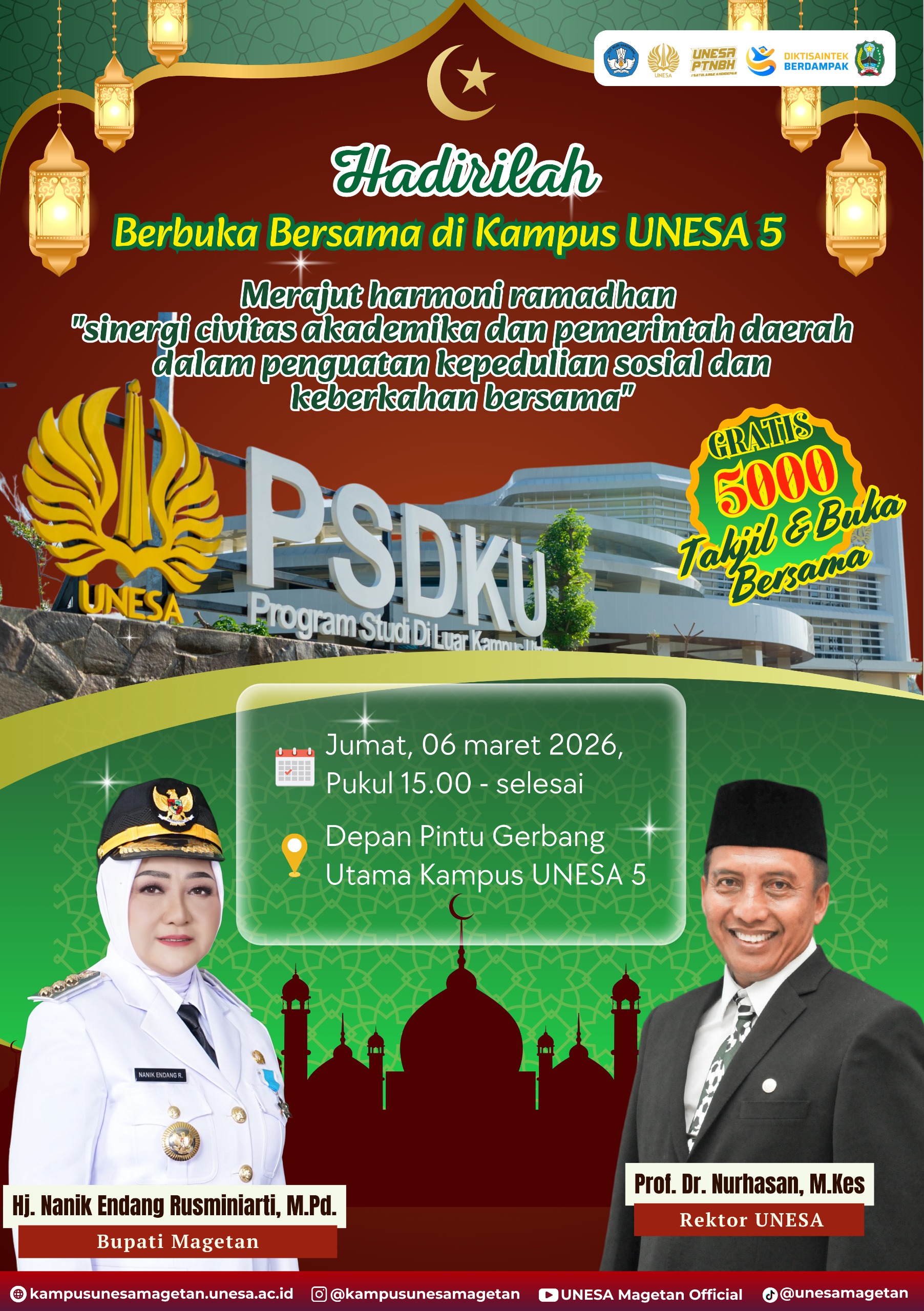 Magetan, 2 Maret 2025 — Dalam rangka menyemarakkan bulan suci Ramadan 1446 H serta mempererat ukhuwah dan kepedulian sosial, Universitas Negeri Surabaya (UNESA) Kampus UNESA 5 akan menyelenggarakan kegiata