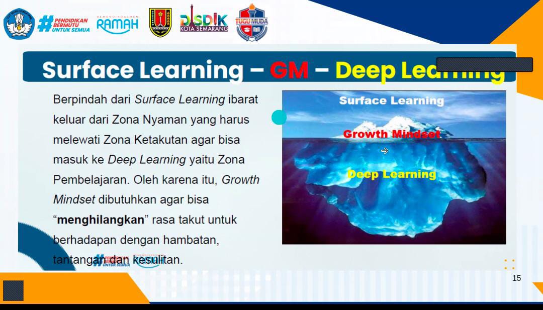 Pendidikan merupakan salah satu usaha menyiapkan sumber daya manusia yang unggul dan berkualitas. Sumber daya manusia yang unggul dapat dibentuk melalui Pendidikan yang berkualitas, Pendidikan yang berkualitas diciptakan melalui pembelajaran yang bermakna. Pembelajaran bermakna adalah proses belajar di mana informasi yang diterima oleh siswa benar-benar dipahami dan dihubungkan dengan pengetahuan yang sudah ada sebelumnya. Jadi, tidak hanya sekedar menghafal, tetapi benar-benar memahami informasi yang disampaikan. Strategi yang dapat dilakukan untuk menciptakan pembelajaran bermakna salah satunya adalah melalui pembelajaran mendalam (deep learning). Pembelajaran mendalam adalah pendekatan pembelajaran yang memuliakan siswa dengan memfalisitasi siswa untuk berkembang sesuai dengan bakat minat mereka, siswa akan belajar dengan menggembirakan yang melibatkan olah pikir, olah hati, dan olahraga secara holistik dan terpadu.